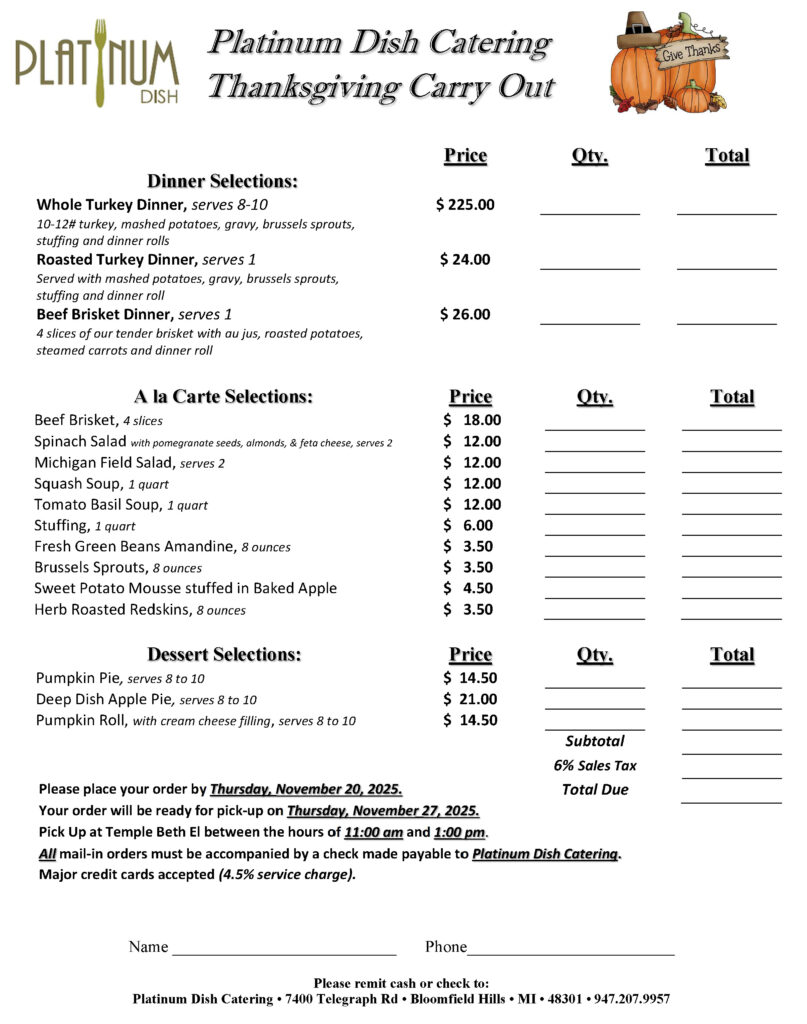 To place an order or for more information, contact Jenny Telck, Platinum Dish Catering at 947.207.9957 or